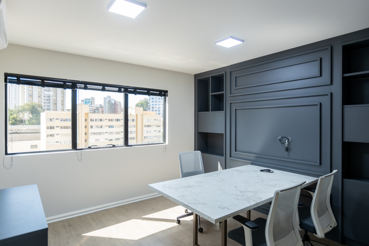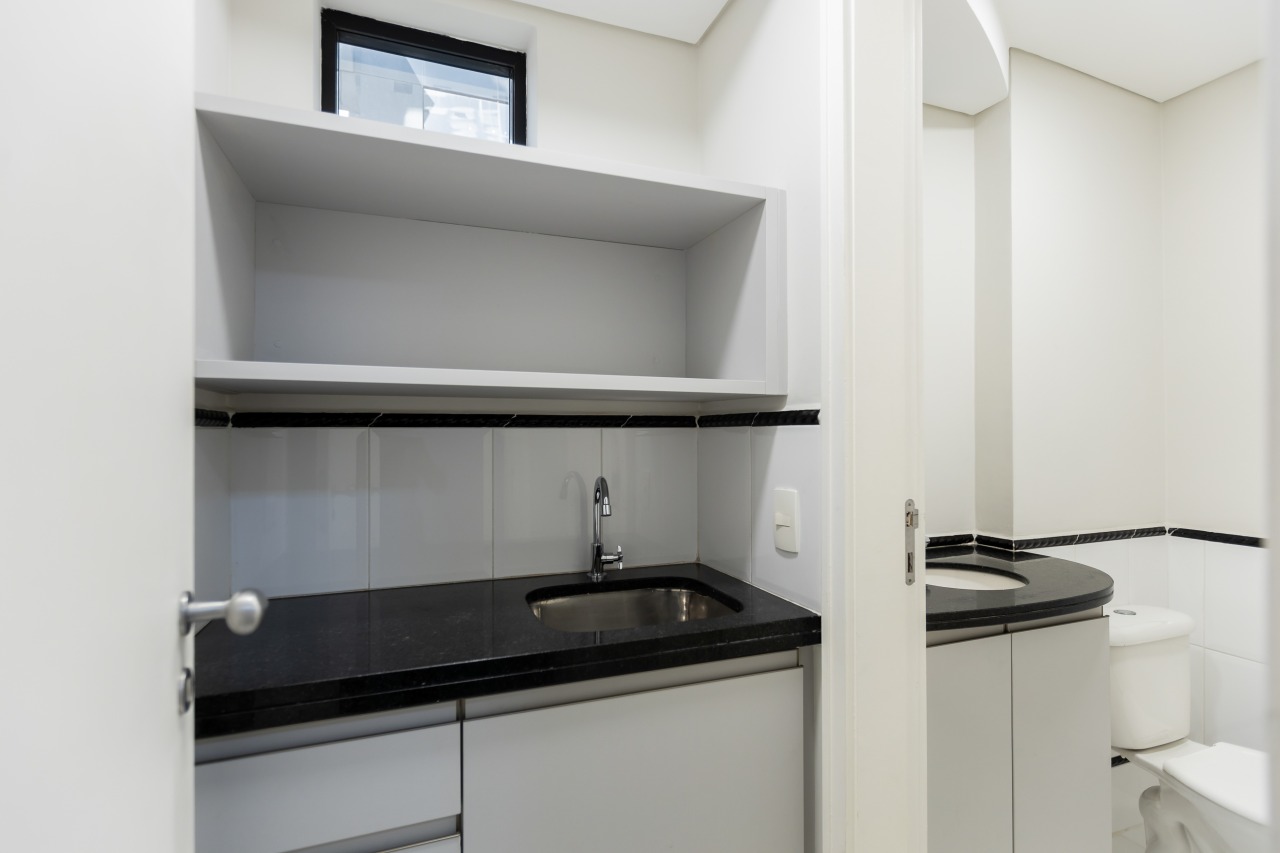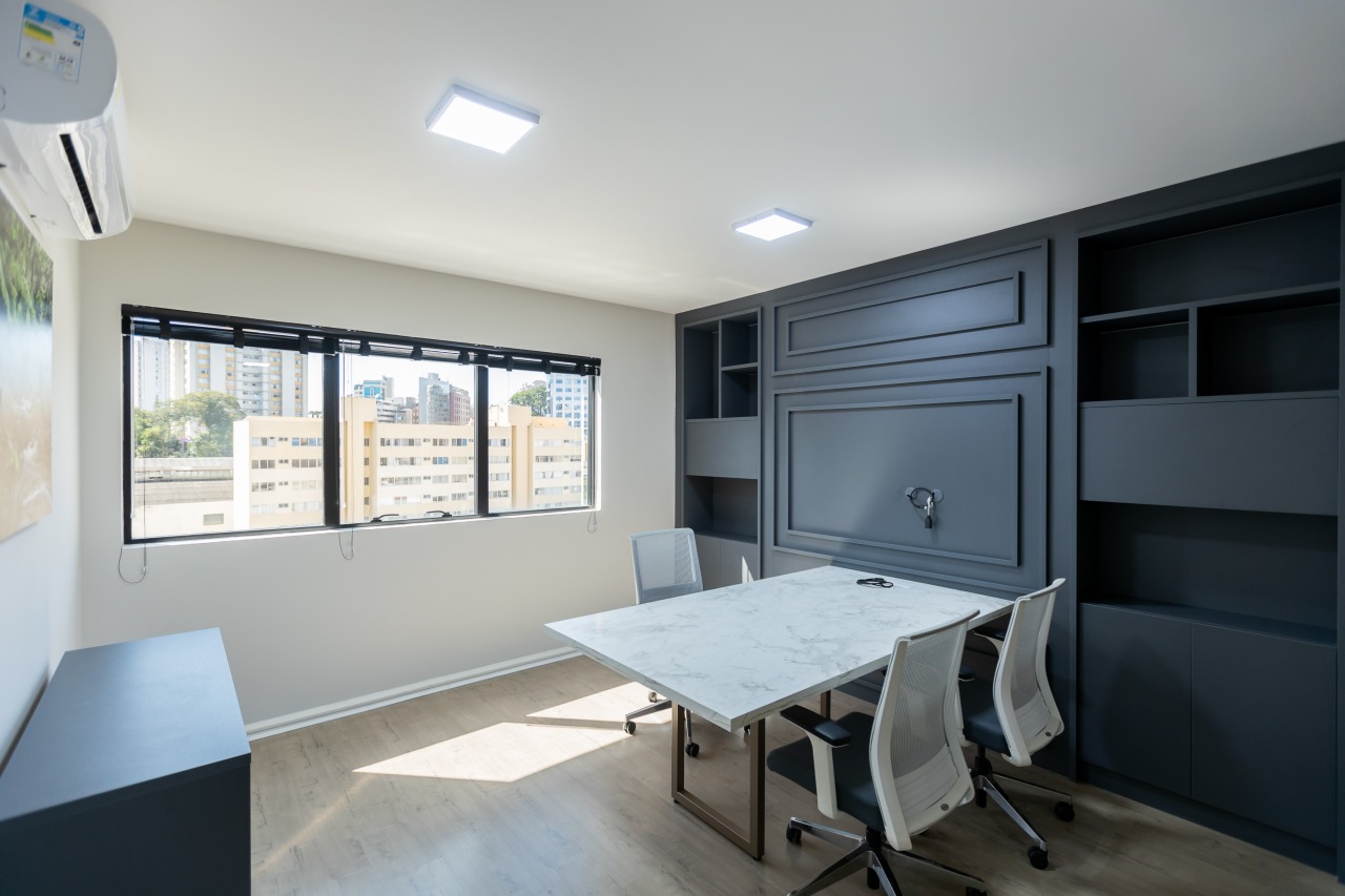 Excelente sala comercial exclusiva para locação com 29m² de espaço no 3º andar, oferecendo uma bela vista e acomodação confortável para até 4 pessoas trabalharem. A sala mobiliada conta com piso laminado, luminárias, banheiro mobiliados com tampo em granito e copa, além de vir equipada com aparelho de ar condicionado.