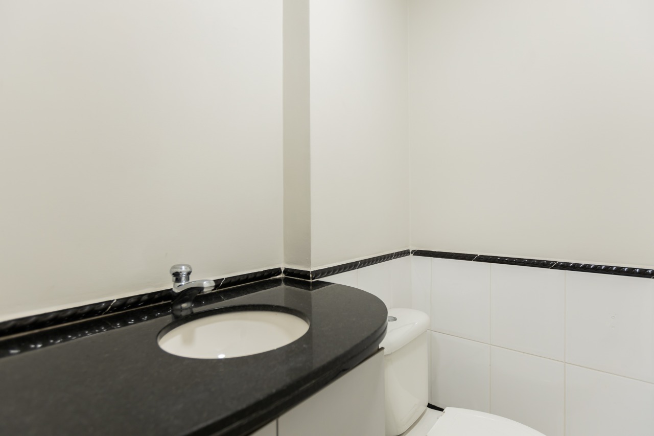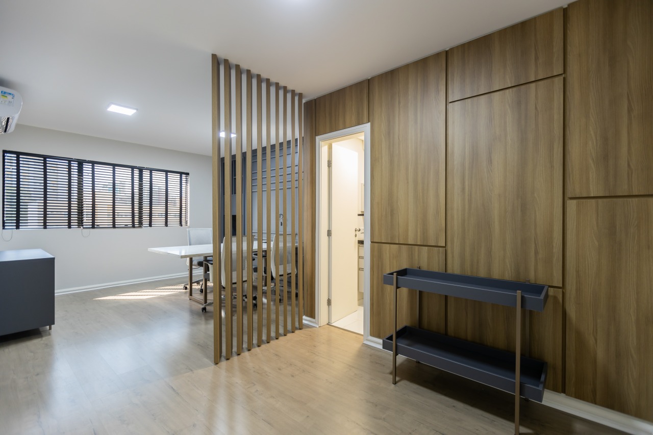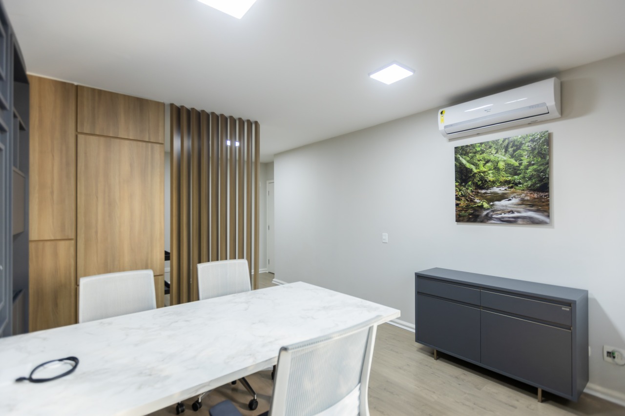Excelente sala comercial exclusiva para locação com 29m² de espaço no 3º andar, oferecendo uma bela vista e acomodação confortável para até 4 pessoas trabalharem. A sala mobiliada conta com piso laminado, luminárias, banheiro mobiliados com tampo em granito e copa, além de vir equipada com aparelho de ar condicionado.