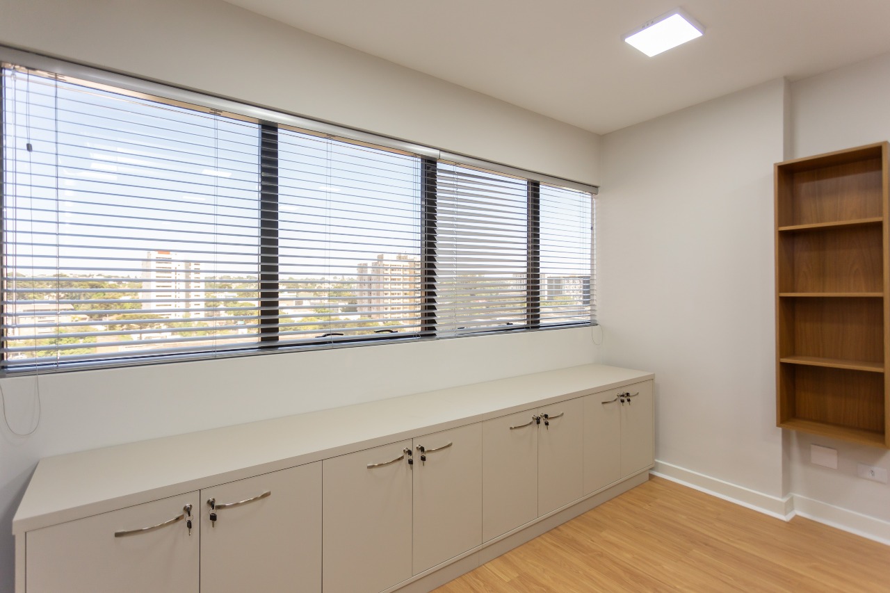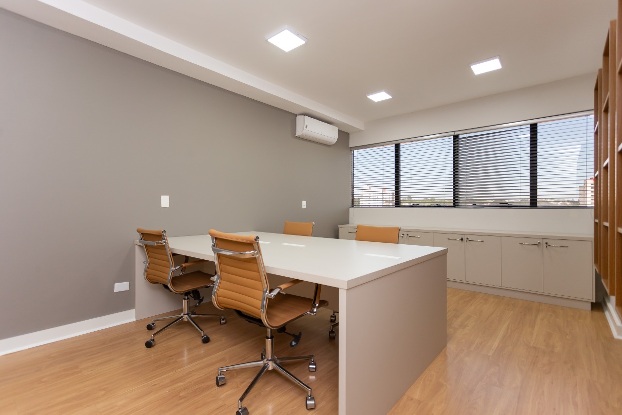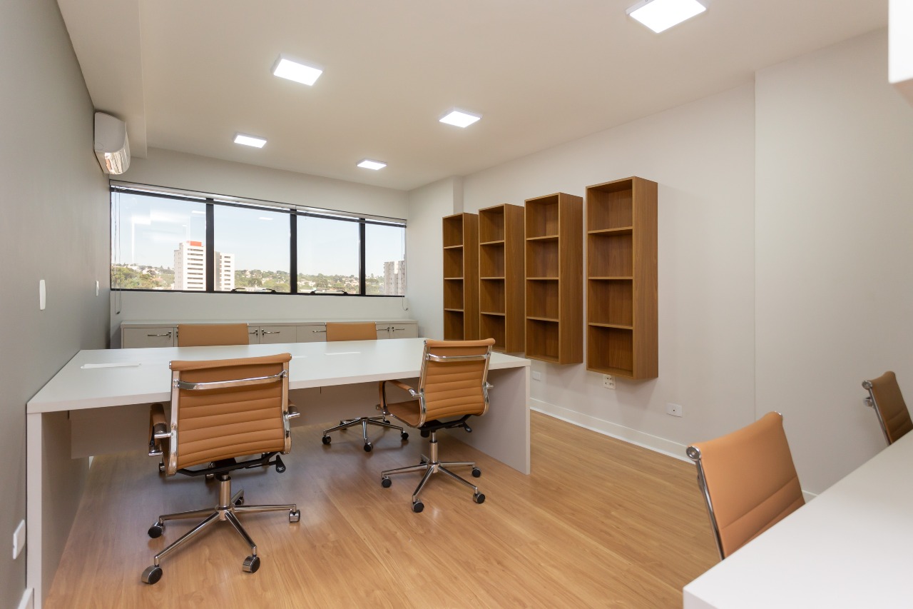 Excelente sala comercial exclusiva para locação com 35m² de espaço no 7º andar, oferecendo uma bela vista e acomodação confortável para até 5 pessoas trabalharem. A sala conta piso laminado, luminárias, banheiro mobiliados com tampo em granito e copa, além de vir equipada aparelhos de ar condicionado.