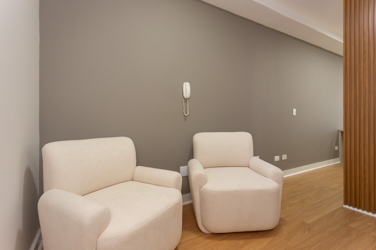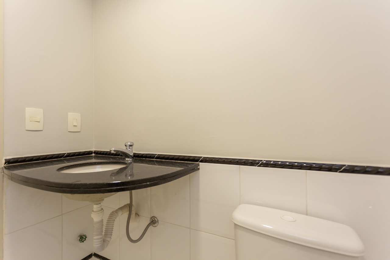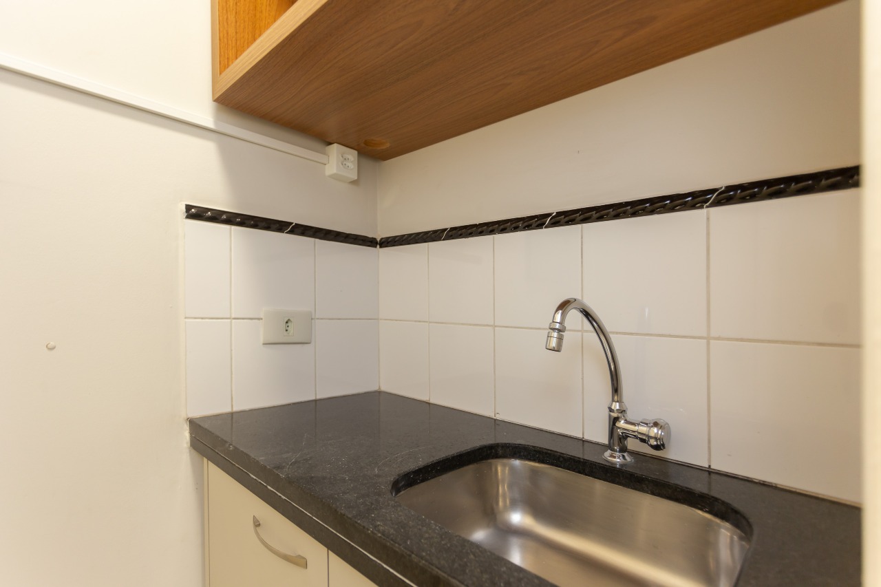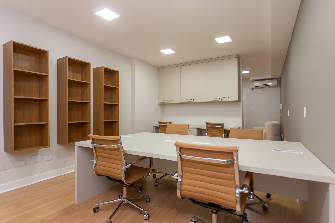 Excelente sala comercial exclusiva para locação com 35m² de espaço no 7º andar, oferecendo uma bela vista e acomodação confortável para até 5 pessoas trabalharem. A sala conta piso laminado, luminárias, banheiro mobiliados com tampo em granito e copa, além de vir equipada aparelhos de ar condicionado.